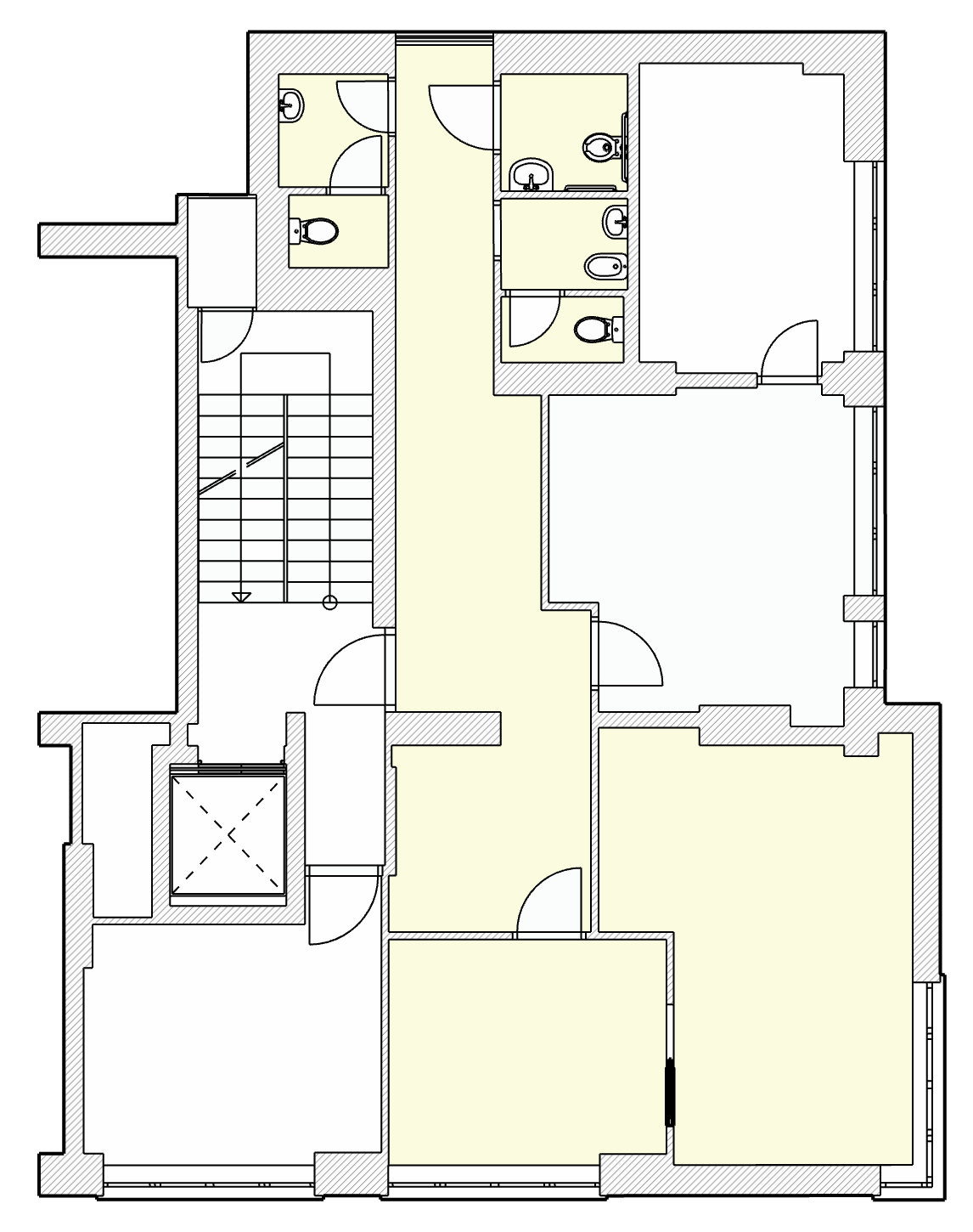 Součástí nájmu jsou společné prostory, které zahrnují chodbu, dvě samostatné umývárny s navazující toaletou, toaletu s umyvadlem, a dále přístup do prostor v 5. nadzemním podlaží, kde se nachází sociální zázemí, sklad a šatny.