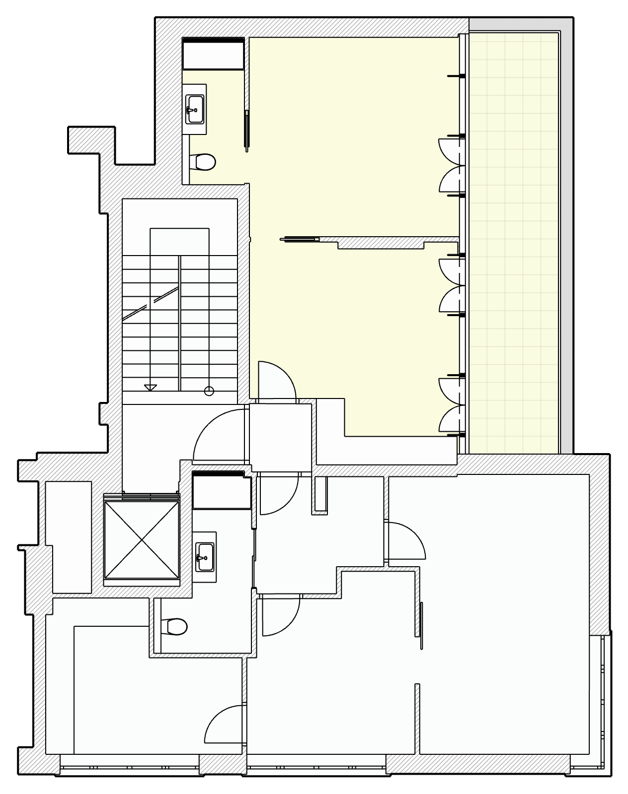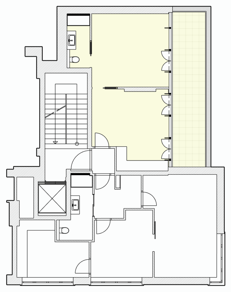 Prostory se nachází v 6. nadzemním podlaží a jsou přístupné z vnitřní chodby budovy. Dispozičně jsou prostory tvořeny dvěma navazujícími místnostmi, přičemž vstupní místnost je vybavena kuchyňskou linkou. Dispozice nabízí praktické řešení jako kancelář se zázemím nebo jednací místností.