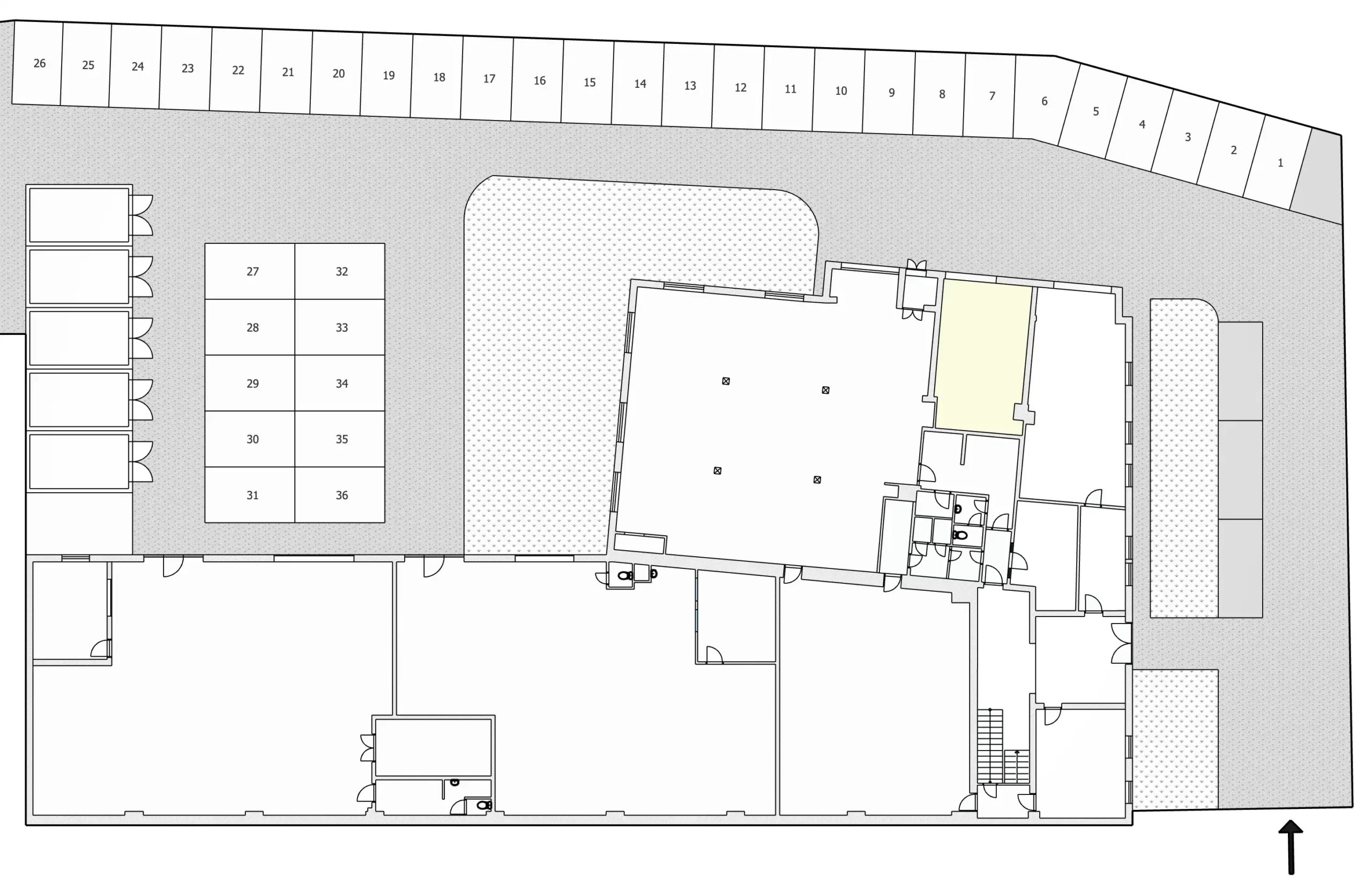 Objekt je napojen na elektrickou energii, vodu a centrální vytápění. Po domluvě lze využívat WC v administrativní budově.